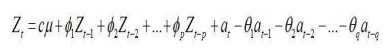 Existen diferentes métodos para el análisis de series temporales [13], sin embargo, en esta investigación se trabajará con la metodologíadeBox yJenkins [14]quepropone el modelo de Promedio Móvil Autoregresivo Integrado, ARIMA, explica el valor de la serie en función de la combinación de dos polinomios: el polinomio autoregresivo, AR, y el promedio móvil, MA (Ecuación 1); el ajuste del modelo ARIMA se realiza con base en la exploración de las funciones de autocorrelación y de autocorrelación parcial que se obtienenuna vez ajustadas a una forma estacionaria a través de diferenciaciones simples o estacionales para estabilizar la media y transformaciones para estabilizar la varianza [12].